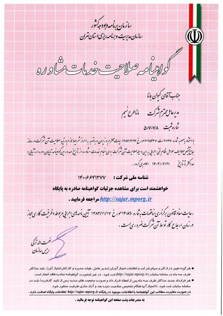 مهندسین مشاور مانا طرح نسیم از سال 1395 در زمینه مطالعات، طراحی و نظارت پروژه‌های زیرساخت جاده‌ای شامل آزادراه، بزرگراه، راه و پل فعالیت می‌کند. این مجموعه دارای گواهی صلاحیت پایه 3 راهسازی از سازمان برنامه و بودجه است.